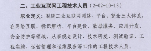 工業(yè)互聯(lián)網(wǎng)是新出來的業(yè)態(tài),工業(yè)互聯(lián)網(wǎng)工程技術(shù)人員的職業(yè)定義是:圍繞工業(yè)互聯(lián)網(wǎng)網(wǎng)絡(luò)、平臺(tái)、安全三大體系,在網(wǎng)絡(luò)互聯(lián)、標(biāo)識(shí)解析、平臺(tái)建設(shè)、數(shù)據(jù)服務(wù)、應(yīng)用開發(fā)、安全防護(hù)等領(lǐng)域,從事規(guī)劃設(shè)計(jì)、技術(shù)開發(fā)、測(cè)試驗(yàn)證、工程實(shí)施、運(yùn)營(yíng)管理和運(yùn)維服務(wù)等工作的工程技術(shù)人員。