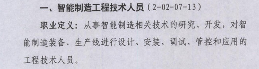 像《通告》里的智能制造工程技術(shù)人員,職業(yè)定義為:從事智能制造相關(guān)技術(shù)的研究、開發(fā)、對(duì)智能制造裝備、生產(chǎn)線進(jìn)行設(shè)計(jì)、安裝、調(diào)試、管控和應(yīng)用的工程技術(shù)人員。